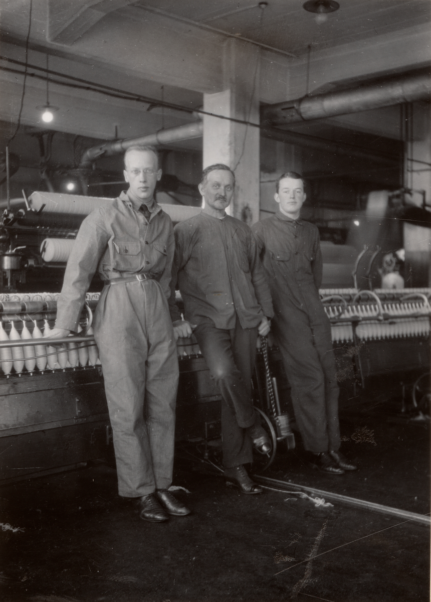 AB Törnell & Ringström. Interiör från spinneriet. Disponent Ernst Törnells son, kandidat Esse Törnell, spinnare Andersson och elev Abrahamsson, 1929.