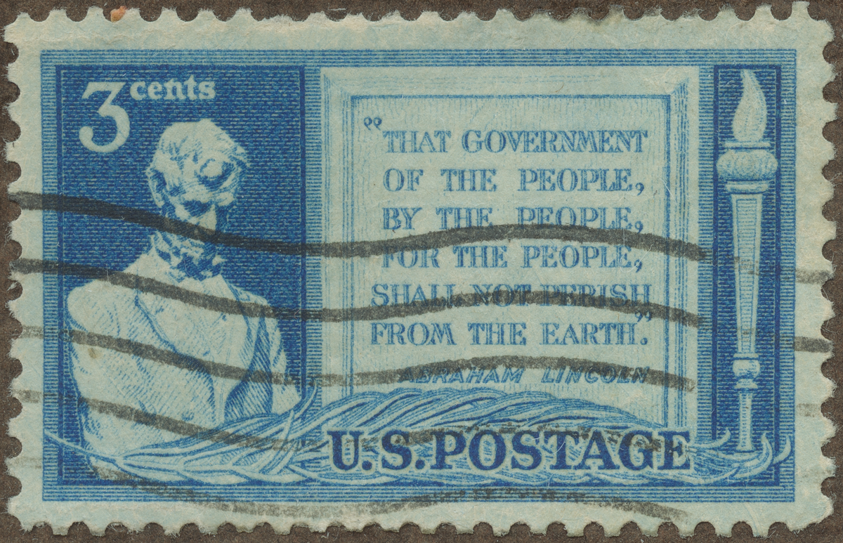 Frimärke från U.S.A., 1948. Motiv av Abraham Lincoln: 1809-1865. bredvid minnestavlan i Gettysburg, Penn. var han 1863 höll sitt berömda tal: ... "... That government ot the people By the people For the people Shall not perish from the earth..." - 85-årsminne av Gettysburg talan: 1863-1948-
