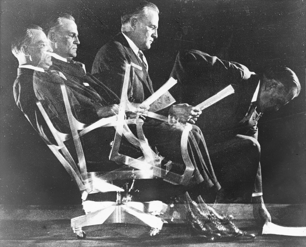 Illustration, rörelsefotografi, av man i följbar kontorsstol.