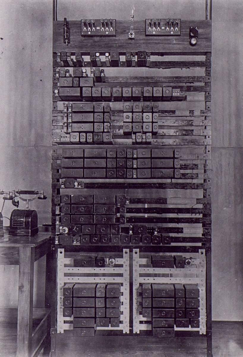 Nya AB Autotelefon Betulander Stockholm (Liljeholmen) april 1915. Provanläggning för mellanledningssystem (reläväxel), uppbyggd som förslag till automatisering av Stockholms telefonnät. (Stativ för understation).