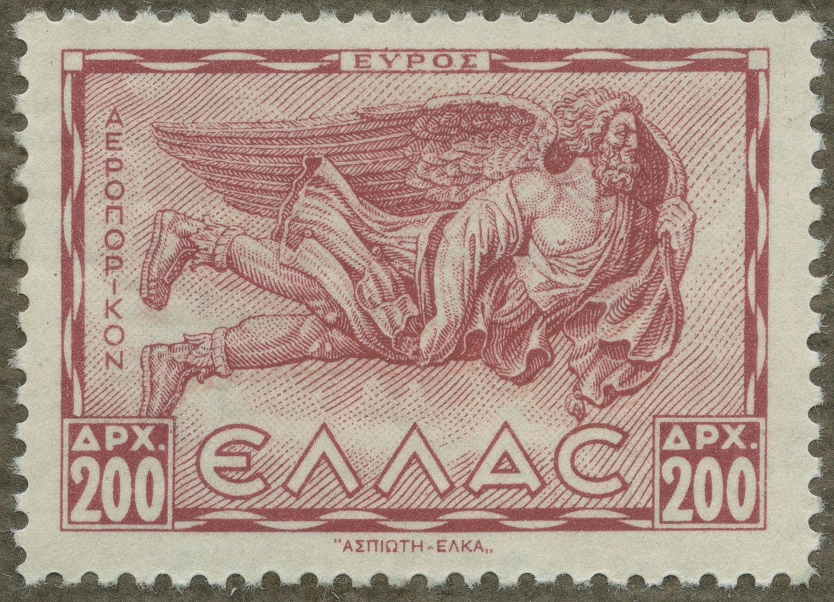 Frimärke ur Gösta Bodmans filatelistiska motivsamling, påbörjad 1950. Frimärke från Grekland, 1942. Motiv av Syd-Ost-vinden "Euros" Flygmärke"