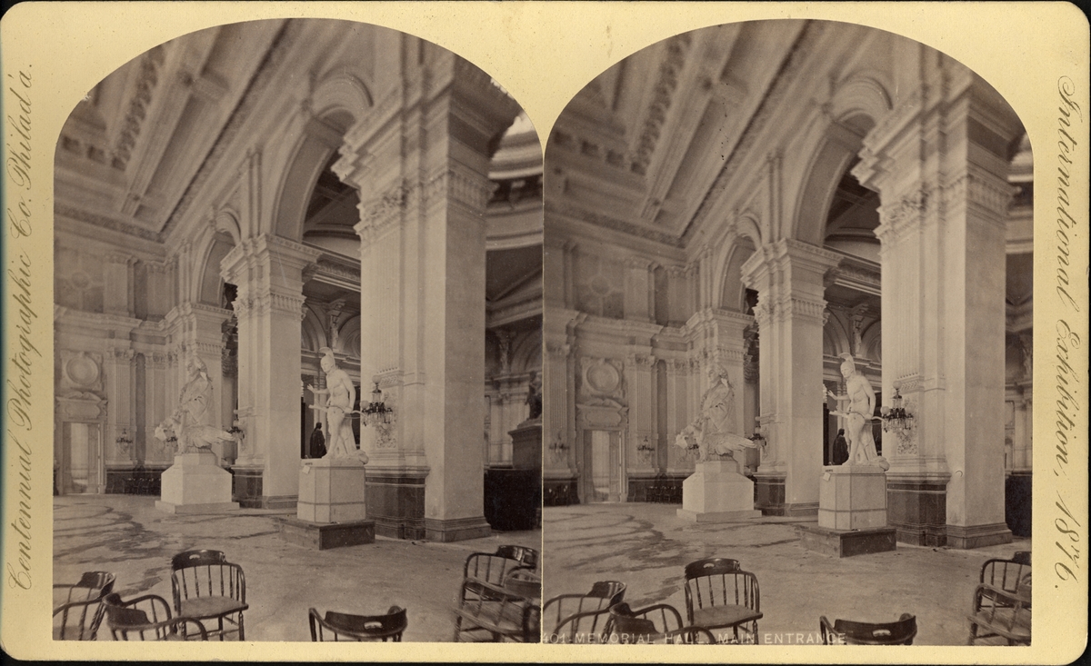 Stereobild av Memorial Hall, huvudentren, Centennial International Exhibition 1876.