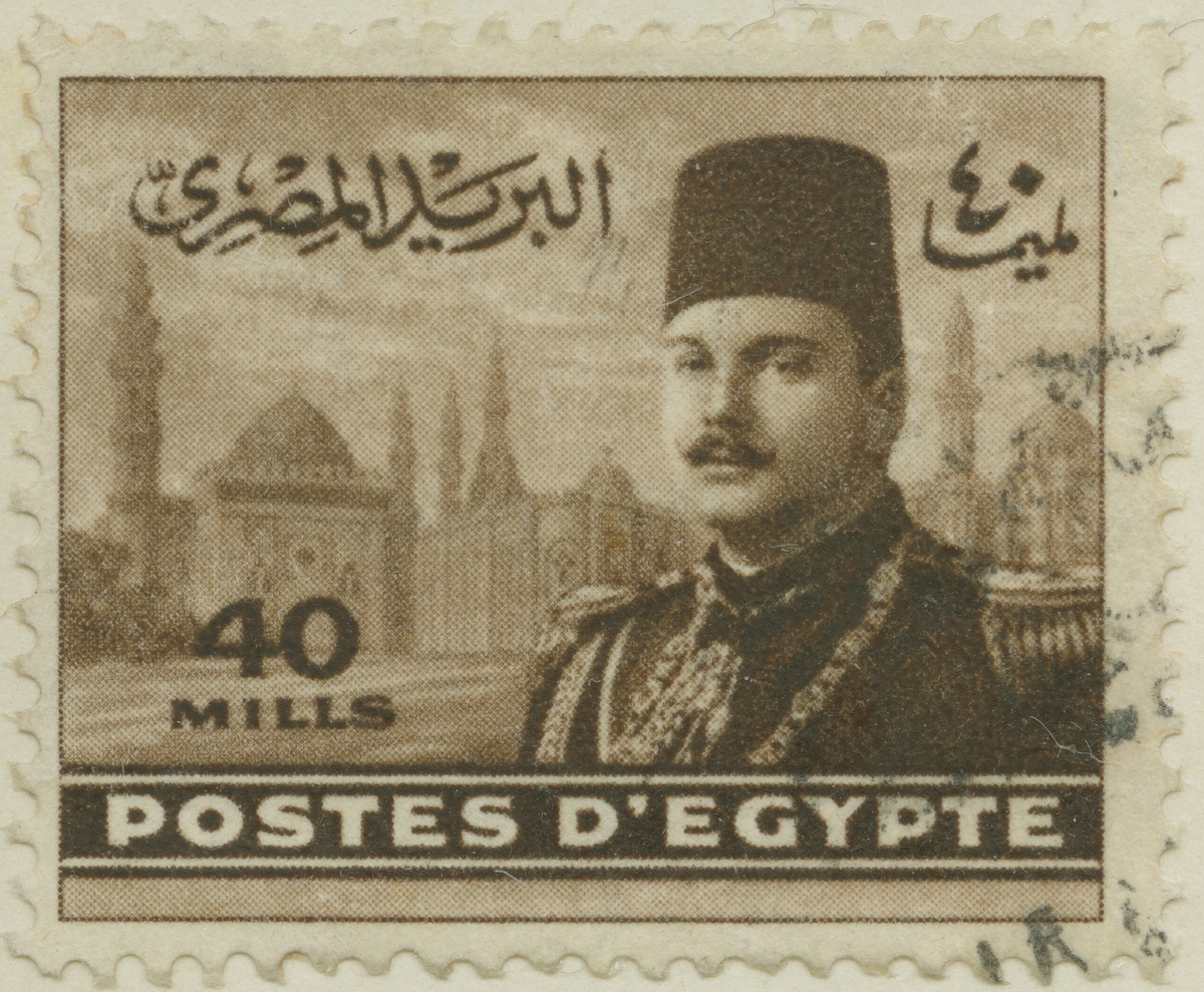 Frimärke från Egypten, 1947. Motiv av El Rifai och Sultan Hussan Moské med Kung Farouk.