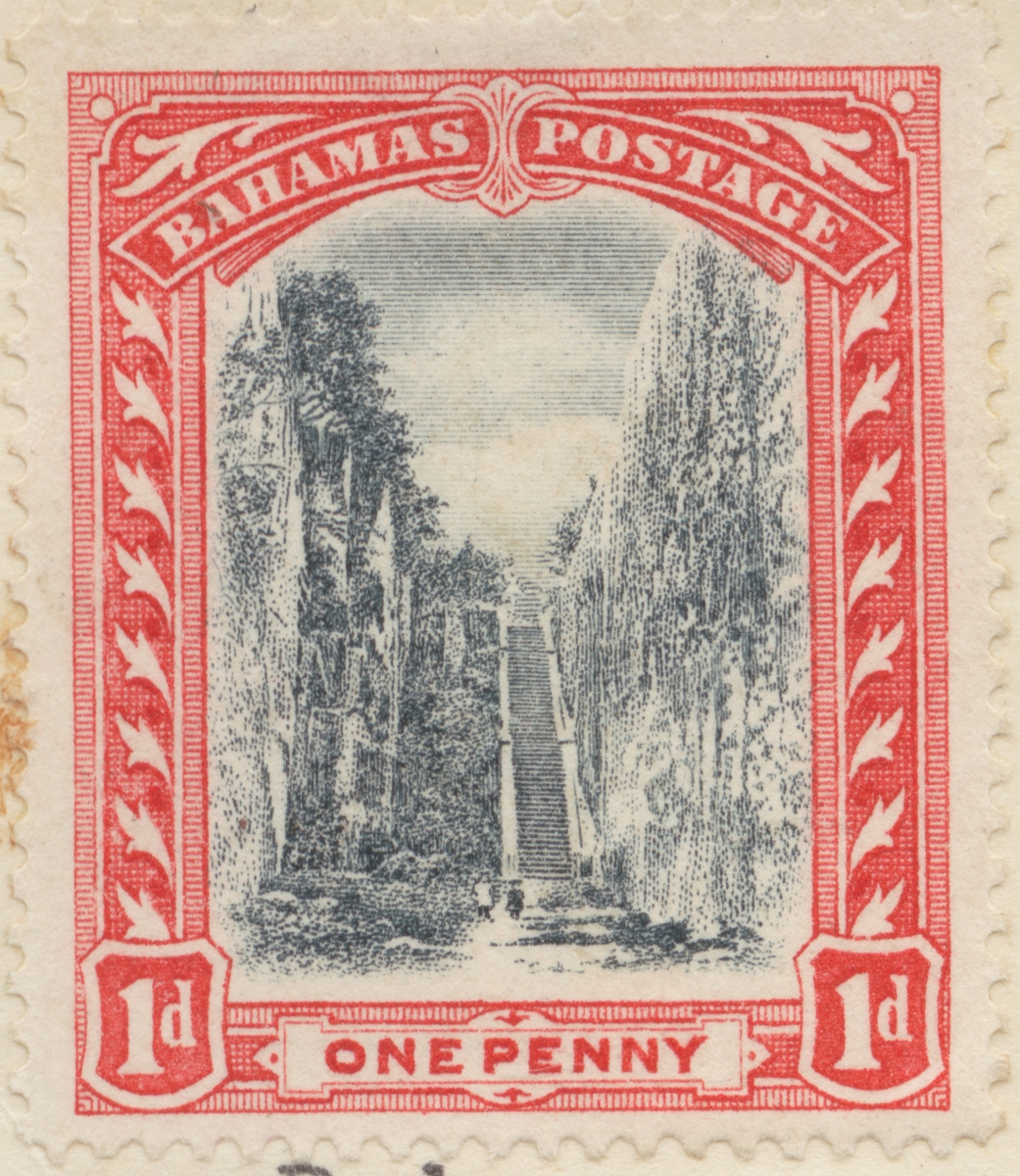 Frimärke från Bahamaöarna (Brittiska Västindien), 1901. Motiv av Drottningstrappan i skogsområde.