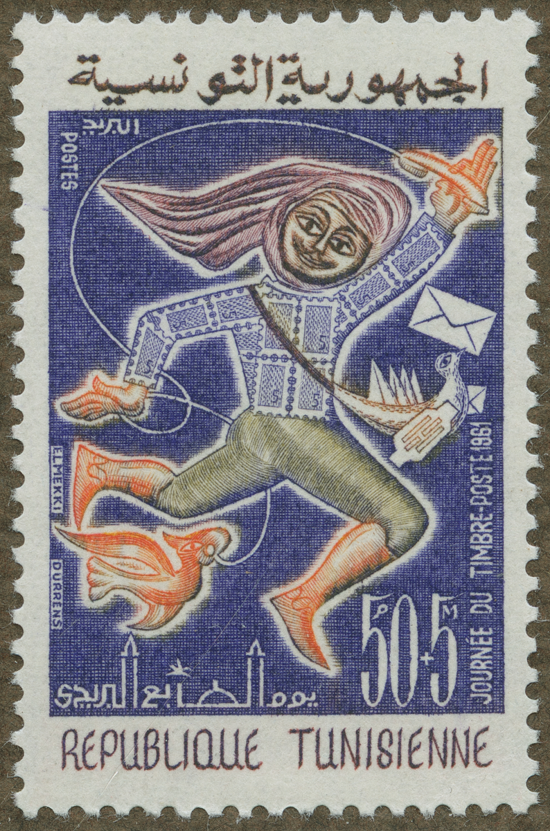 Frimärke från Tunisien, 1961. Motiv av Tunisisk brevbärare till fots och Symbolisk brevduva. -Frimärkets Dag: 1961-