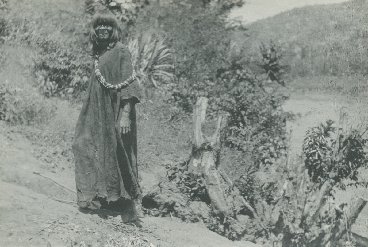 Fotografi från expedition till Peru 1920. Motiv av kvinna stående i liten grusbacke framför buskar.