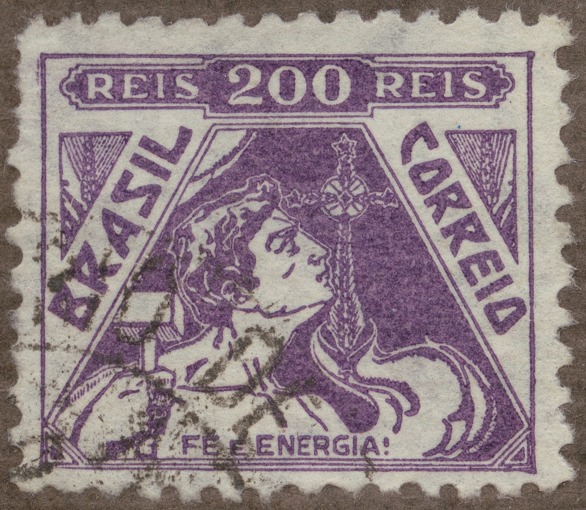 Frimärke ur Gösta Bodmans filatelistiska motivsamling, påbörjad 1950. Frimärke från Brasilien, 1933. Frimärke med motiv av Symbol för Energilagen "Allegori: "Faith and Energy""--