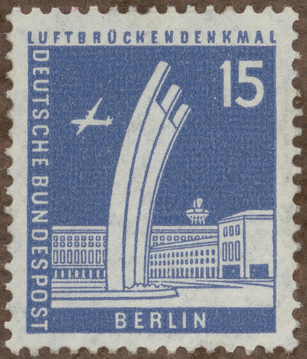 Frimärke från Tyskland, Väst Berlin, 1958. Motiv av Minnesmärke över "Luftbron" i Berlin