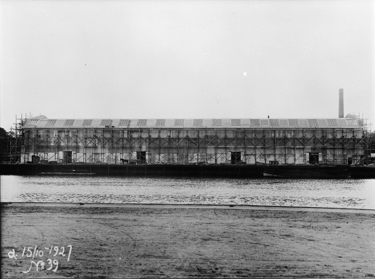 Byggherre: Bygnadaktiebolaget Contractor, Stockholm. General Motors Nordiska AB:s första fabriksbyggnad i Sverige. Arbetsbilder. Hammarbyhamnen 1927.