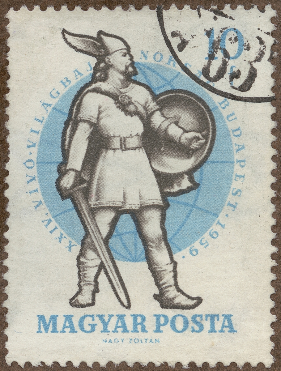 Frimärke från Ungern, 1959. Motiv av Krigare från 900-talet med svärd och sköld -Propaganda för 24-nde världsmästerskap i fäktning i Budapest 1959-