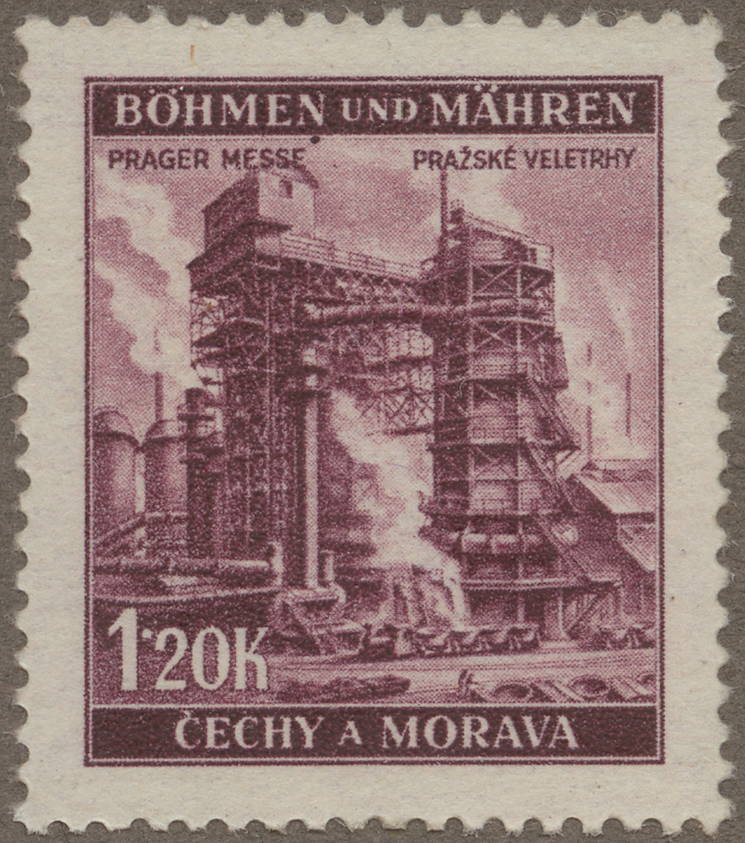Frimärke från Böhmen-Mähren, 1941. Motiv av Masugnsanläggning i Pilsen. Böhmen-Mähren.