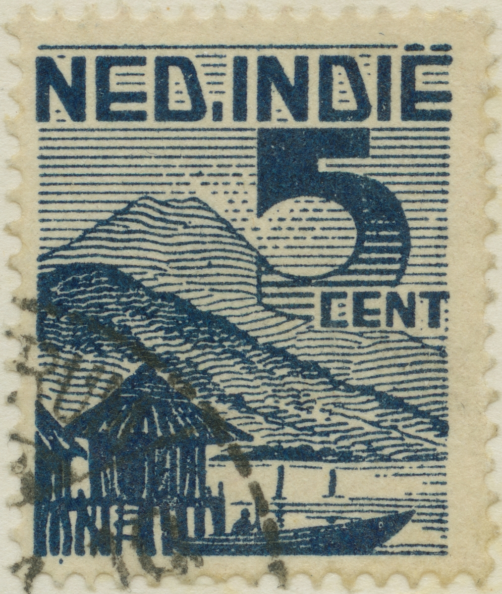Frimärke ur Gösta Bodmans filatelistiska motivsamling, påbörjad 1950. Frimärke från Nederl. Indien, 1946. Motiv av Berg och Sjö "Landskapsbild Sjön Tondano"