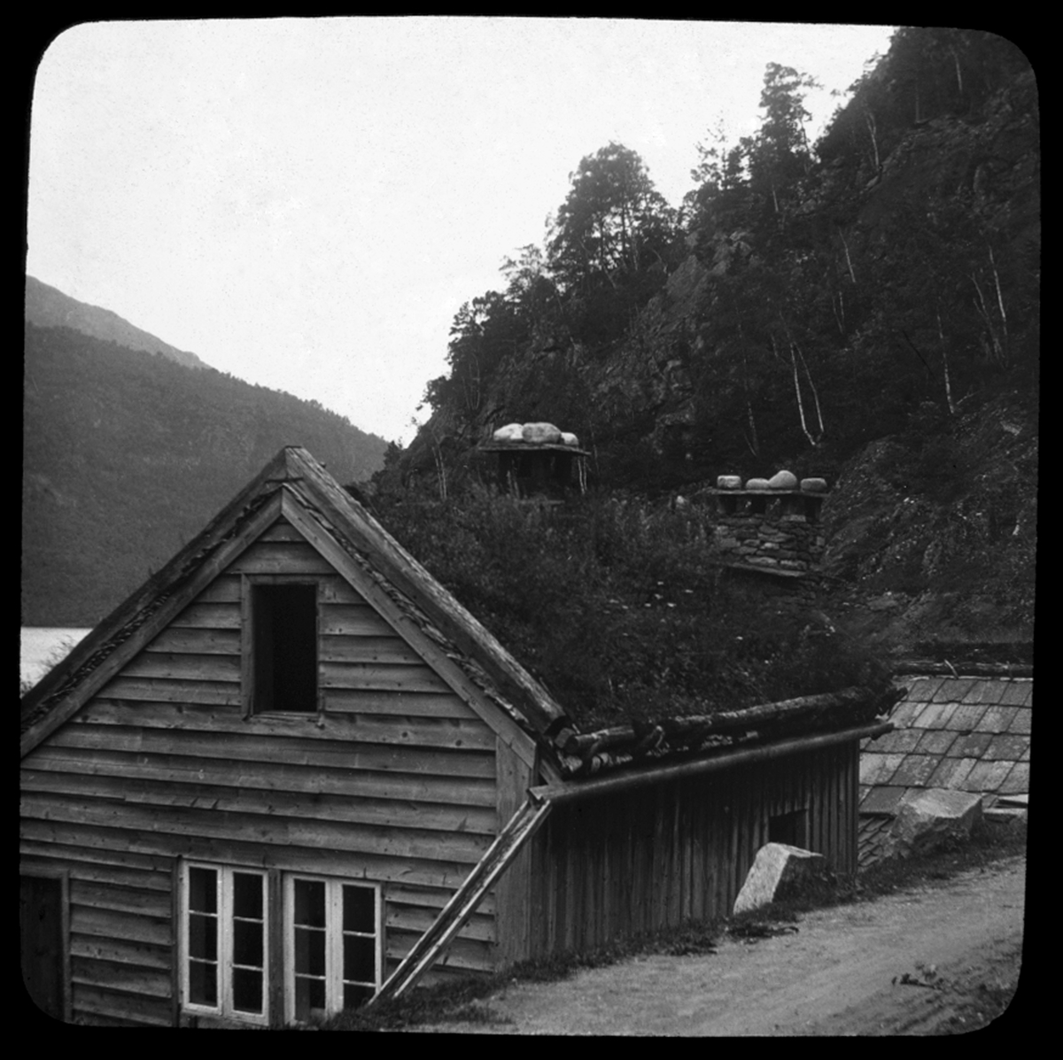 Skioptikonbild från institutionen för fotografi vid Kungliga Tekniska Högskolan. Motiv föreställande hus med grästak.. Bilden är troligen tagen av John Hertzberg.
