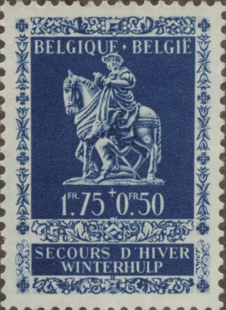 Frimärke från Belgien, 1942. Motiv av St. Martin som offrar sin kappa.