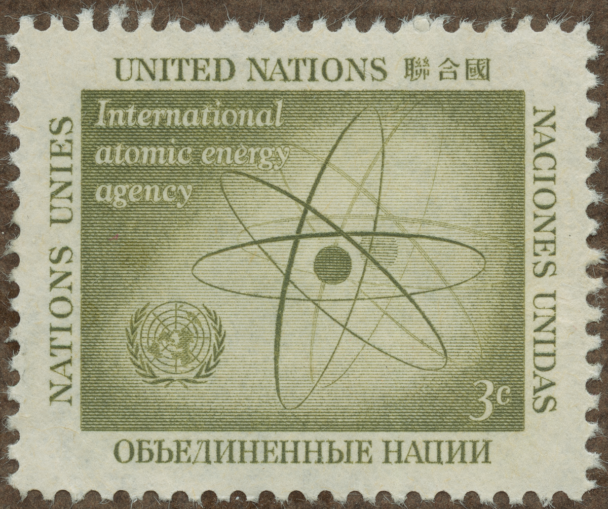 Frimärke från Förenade Nationerna 1958. Motiv av Atom modell FN-emblemet som strålkastare på atomen -Minne om "International Atomic Energy Agency"