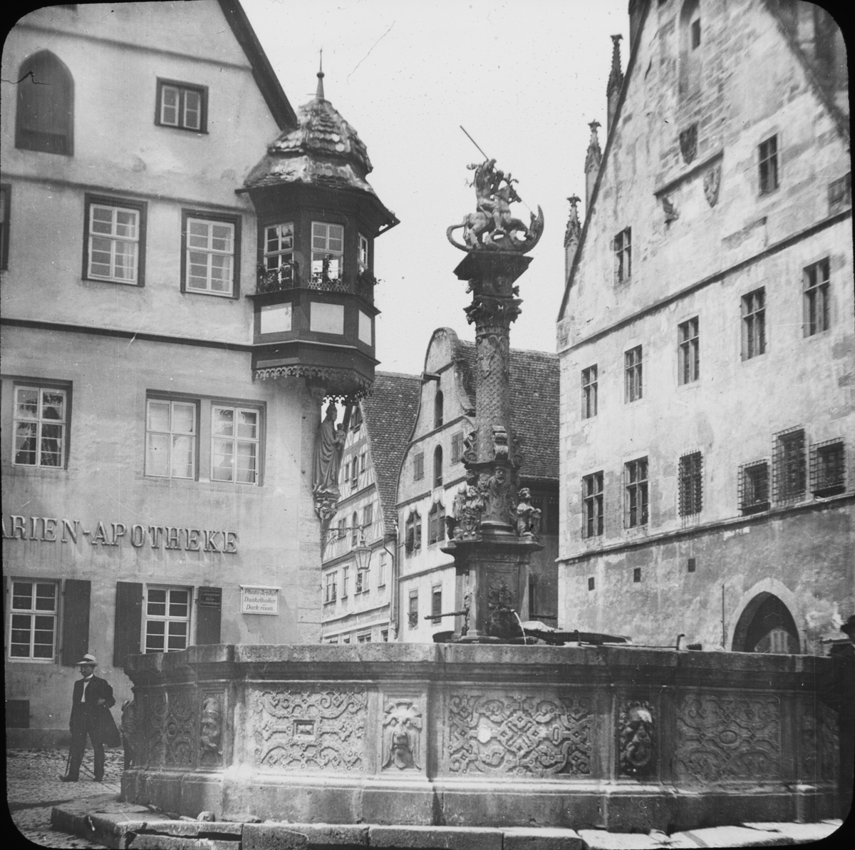 Bilden har förvarats i kartong märkt: Vårresan 1910. Rothenburg. XXVI. Text på bild: "Rothenburg o.d. Tauber Georgen strasse och Weiser Turm".