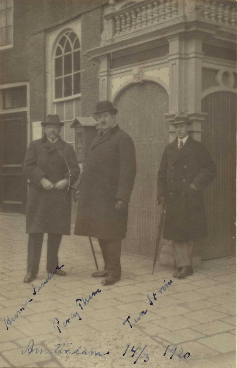 Söndag i Amsterdam. Från vänster: Disponent Herman Sundholm, Konsul Peter Tham och Kapten T. Sjöström, 1920.