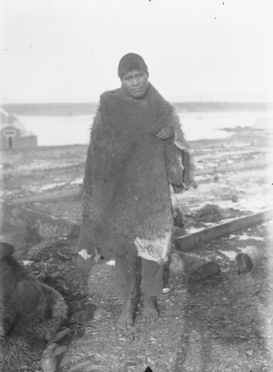 Fotografi från Eldslandet. Motiv av barfota man iklädd djurhud.