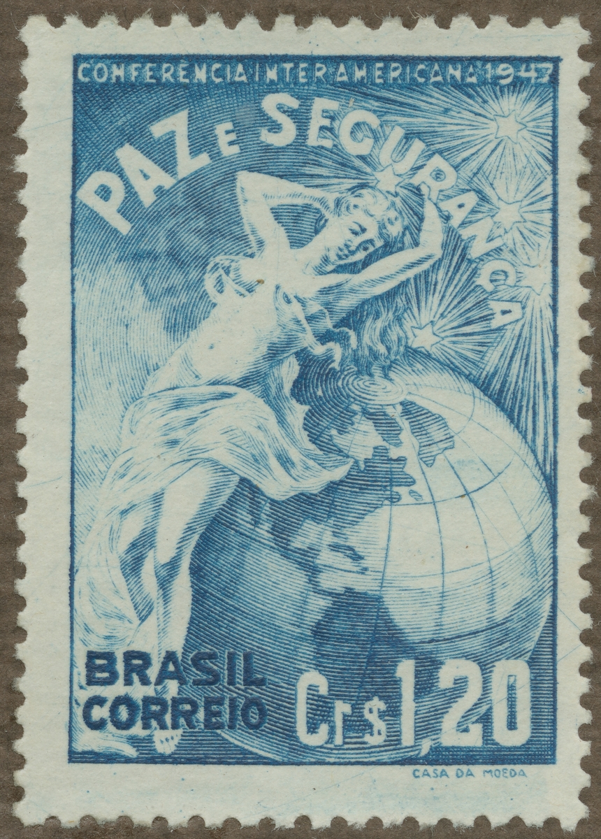 Frimärke från Brasilien, 1947. Motiv av jordglob med den Amerikanska sidan. "Latinamerikansk fredskonferens 1947".