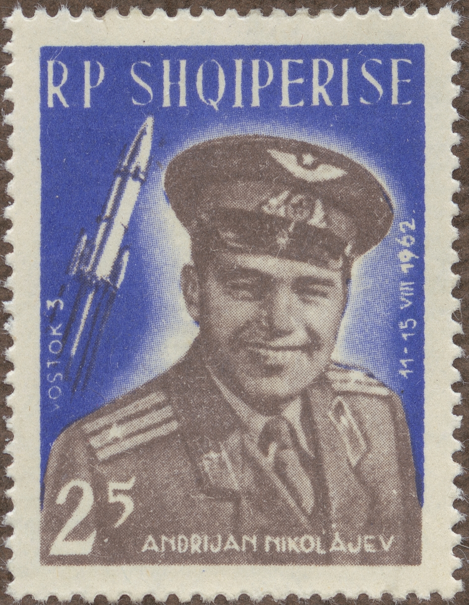 Frimärke från Albanien, 1962. Motiv av Rymdresa: 11-15 augusti 1962: Ryssen Andrijan Nikolajev. "-Astronaut Serie-"