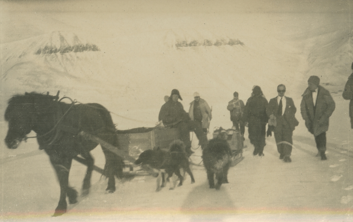 Fotografi från expedition till Spetsbergen. Motiv av expeditionsdeltagare med häst och hundspann i snölandskap.