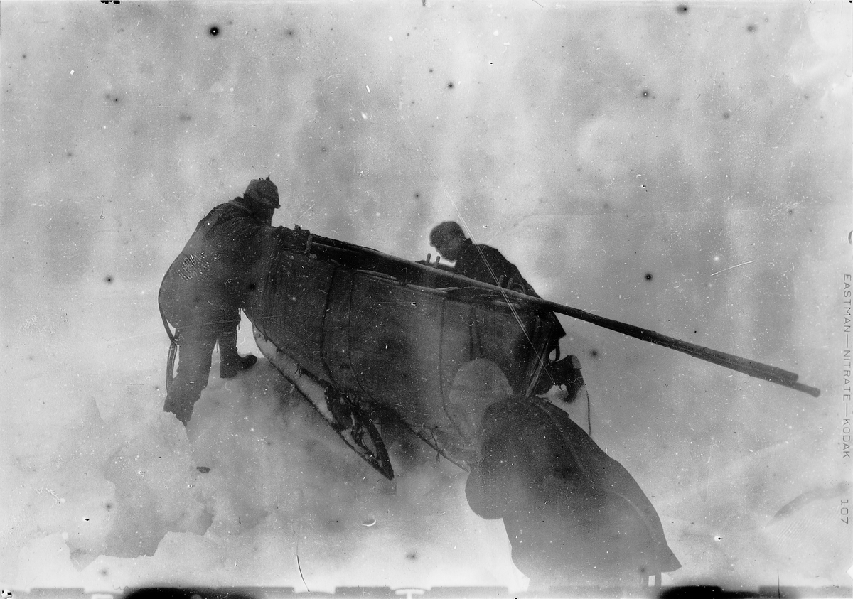 Fraenkels kälke skjutes på båten över en skruvvall. T.v. Fraenkel, t.h. Andrée, i mitten Strindberg. Objektivet på kameran har tydligen varit försett med automatisk utlösning. Framtagning av bilderna gjordes av docent John Hertzberg år 1930 på Fotografi, Tekniska Högskolan.