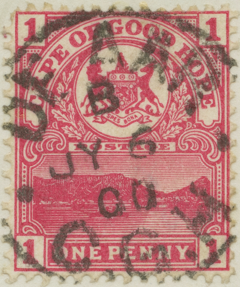 Frimärke ur Gösta Bodmans filatelistiska motivsamling, påbörjad 1950. Frimärke från Syd Afrika Goda Hopps Udden, 1900. Motiv av Goda Hopps Udden Bukten med Taffelberget