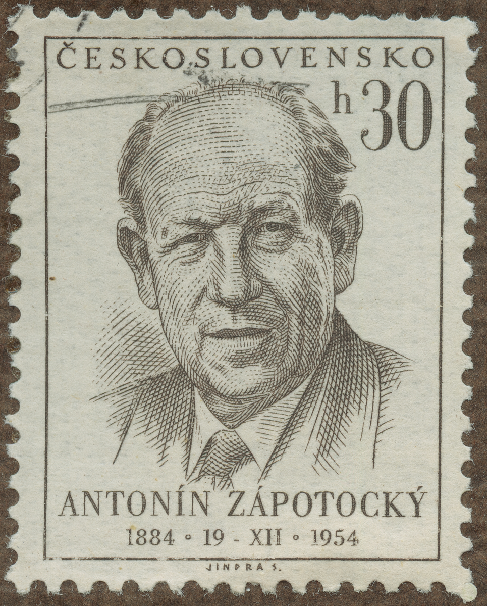 Frimärke från Tjeckoslovakiet, 1954. Motiv av Antonín Zápotocký: 1884-1957. Regeringschef 1948-1953 President 1953-1957. Z. 70 årsdag: 1884-1954.
