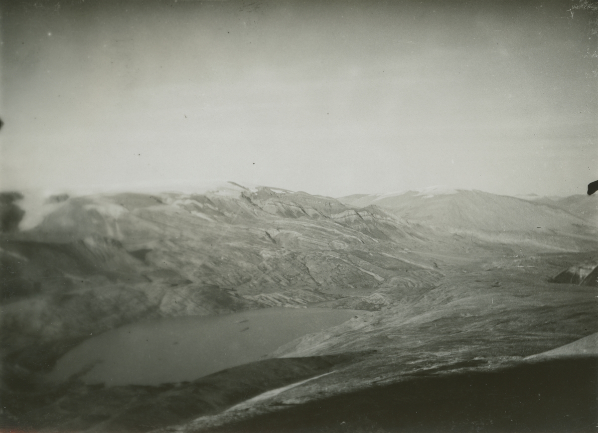 Fotografi från expedition till Östgrönland 1929. Dansk-svensk expedition under ledning av Lauge Koch. Svenska deltagare: Oscar Kulling och Helge Backlund. Vy över ett is- och snötäckt bergslandskap.