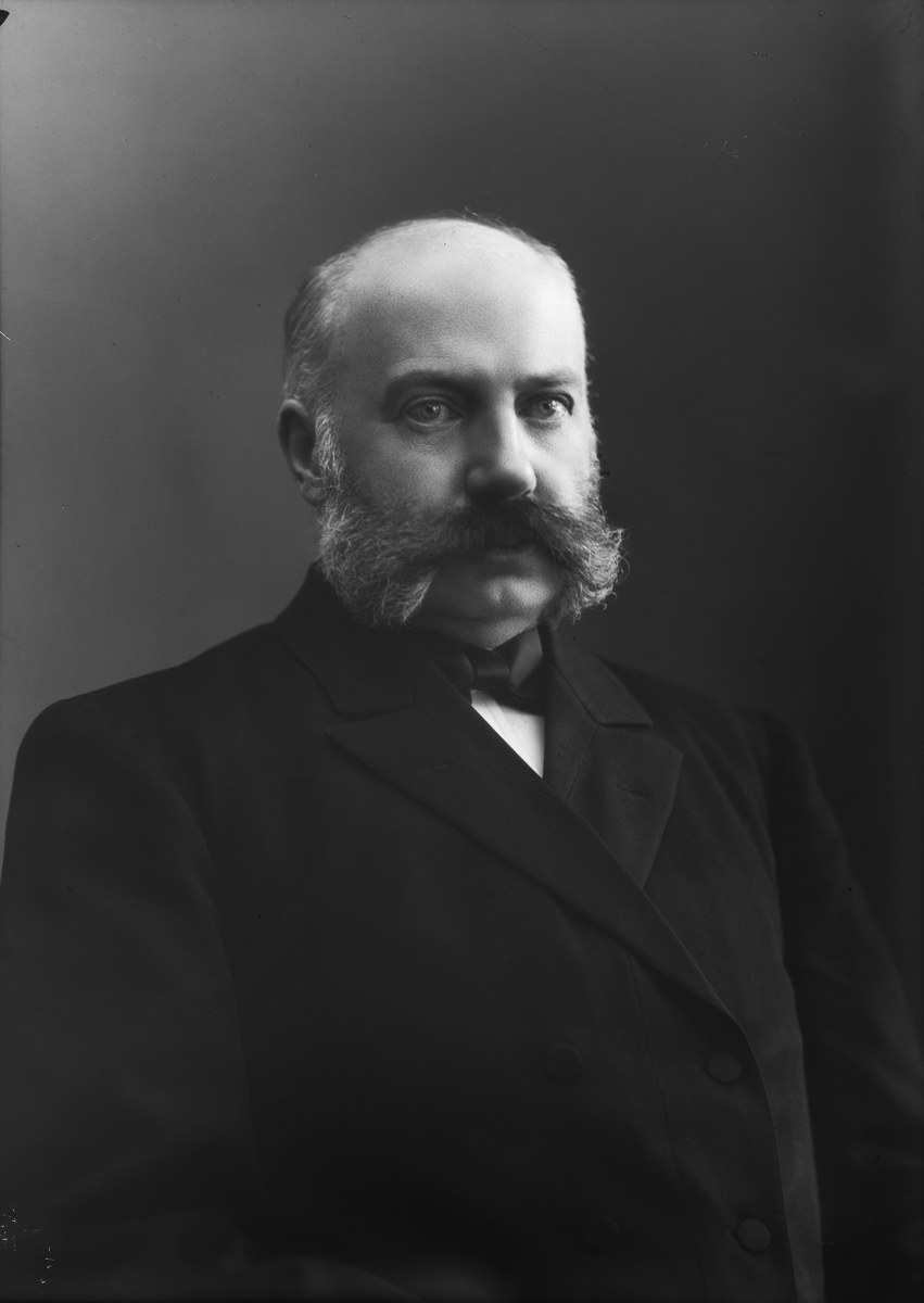 Diapostiv, fönsterbild, porträtt av tunnhårig mustasch- och skäggklädd medelålders man i fluga.