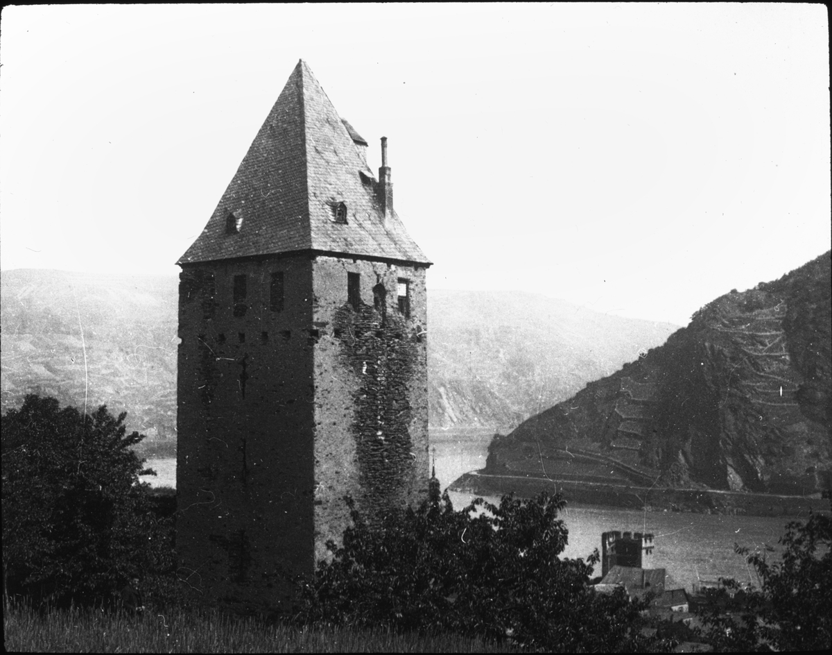 Skioptikonbild med motiv av medeltida torn i Oberwesel.