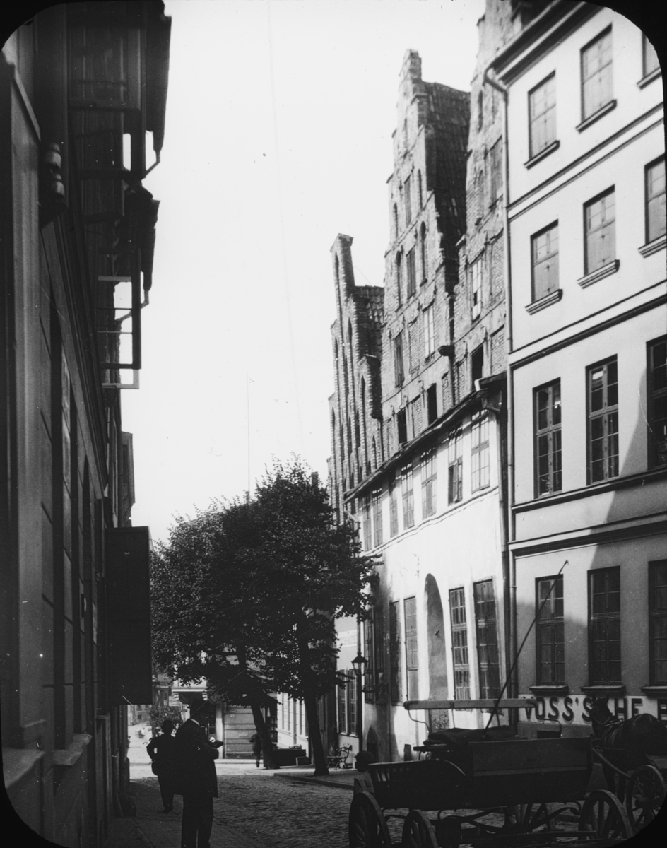 Bilden har förvarats i kartong märkt: Resan 1912. Rostock. Text på bild: "Mühlenstrasse"
