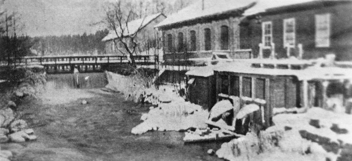 Foto av gammal bild av nedre bruksfallet. Längst till höger synes blåsmaskinhuset till masugnen, vattenrännan samt turbinerna till masugnen.