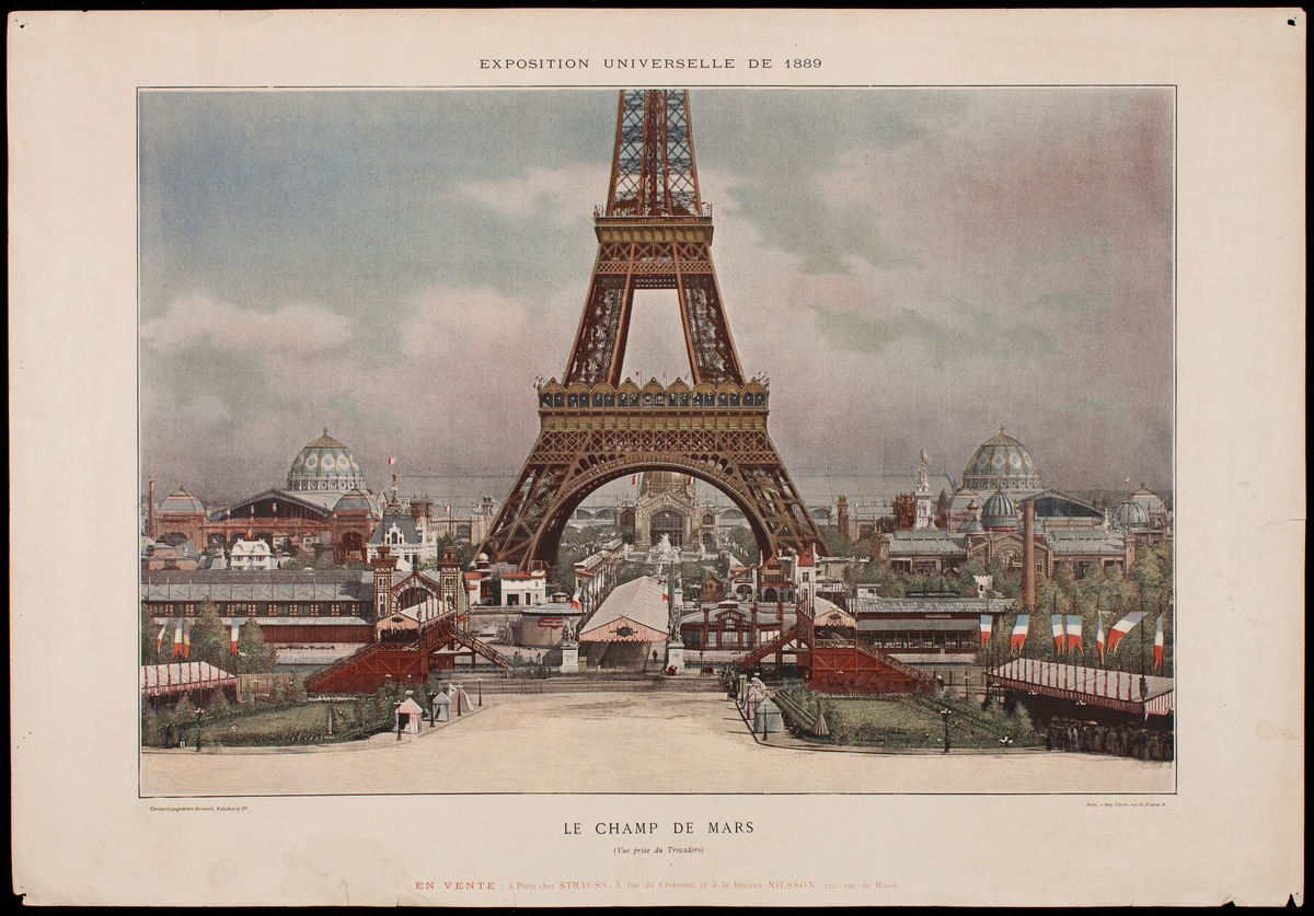 Plansch med motiv av etsning av vy över Världsutställningen 1889, Exposition universelle de 1889. Vy över Eiffeltornet och Champ de Mars mot Trocadero.