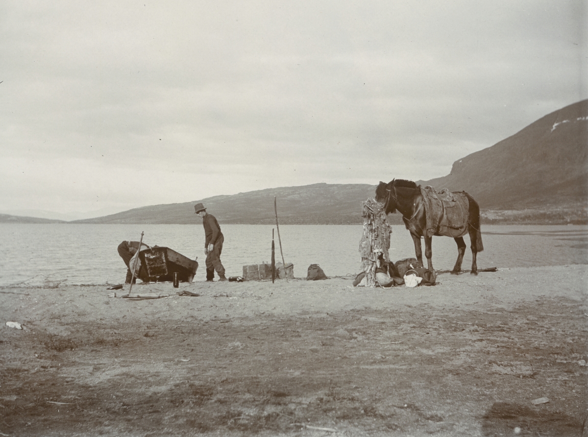 Fotografi från expedition till Grönland. Motiv av man med häst och båt på en karg strand vid havet.