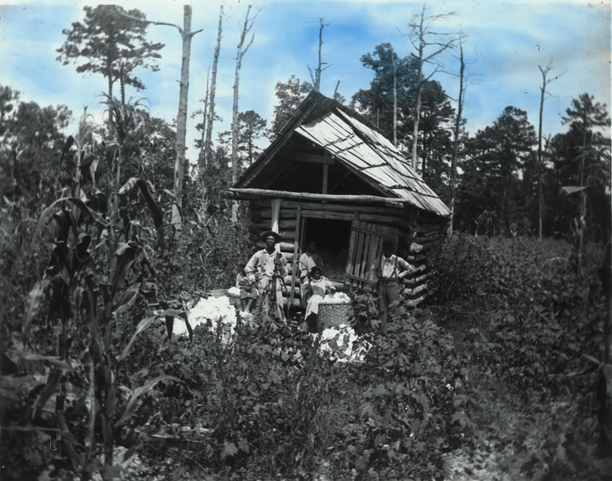 Kolorerad skioptikonbild med motiv från okänd bomullsplantage.