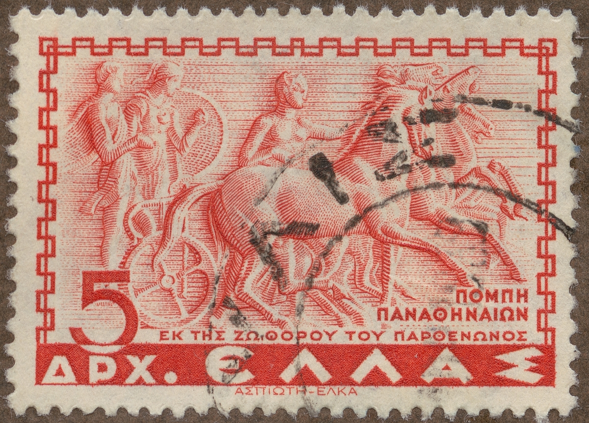 Frimärke ur Gösta Bodmans filatelistiska motivsamling, påbörjad 1950. Frimärke från Grekland, 1937. Motiv av Segrarvagn "vid Panatheniensiska spelen"