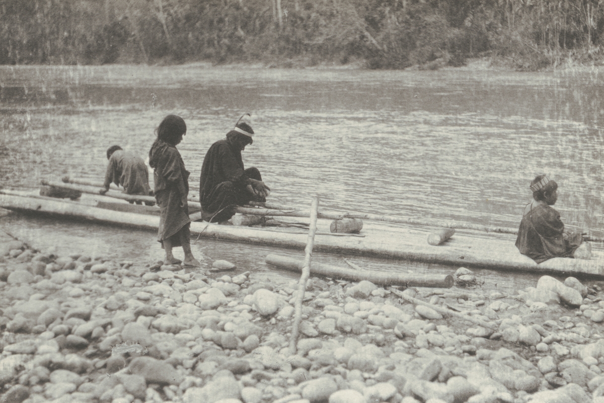 Fotografi från kuvert märkt med "Ernst Nordenskjöld". Motiv av man och barn vid flod i djungel.