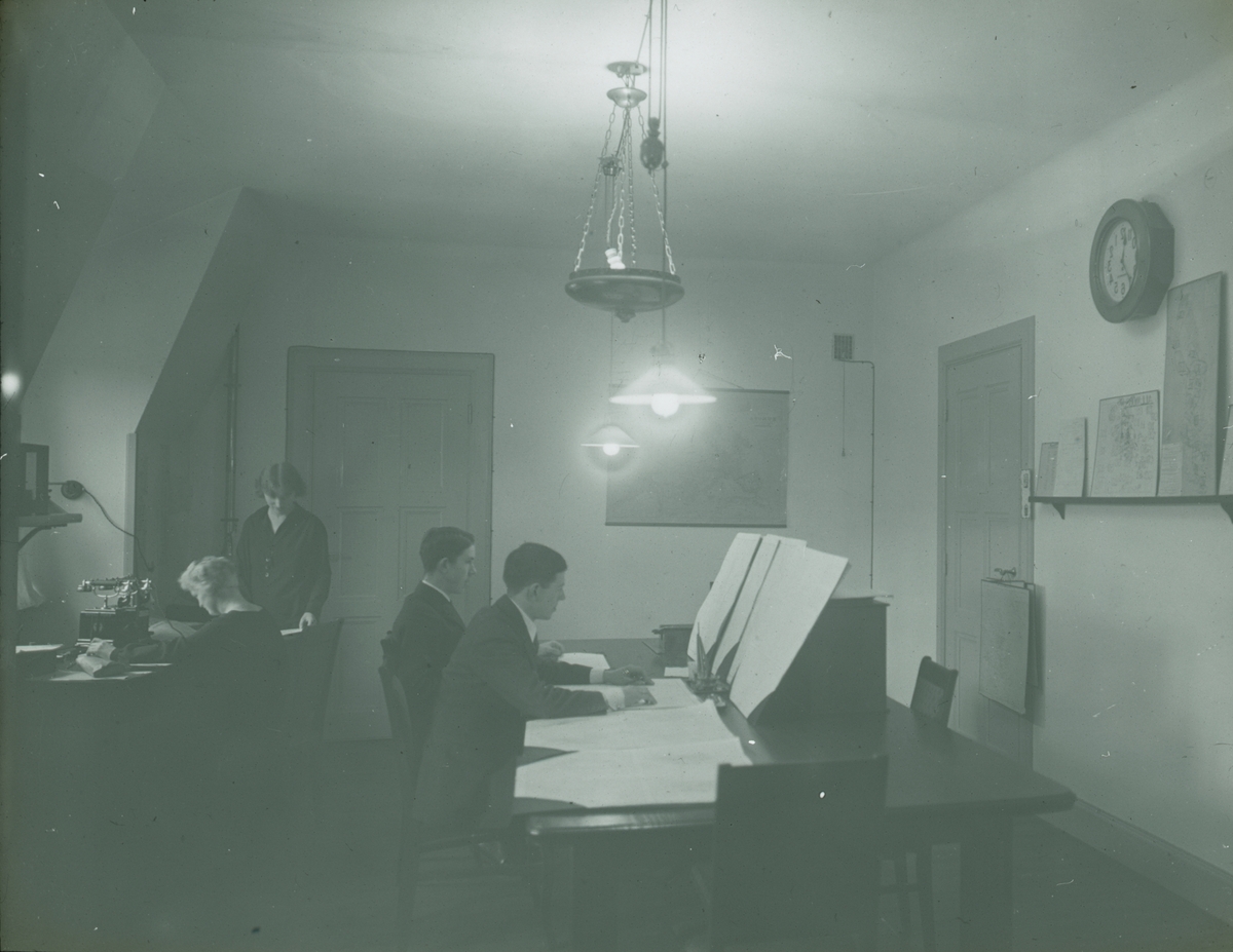 Fotografi från expedition till Spetsbergen. Motiv av två kvinnor och två män som arbetar på kontor.