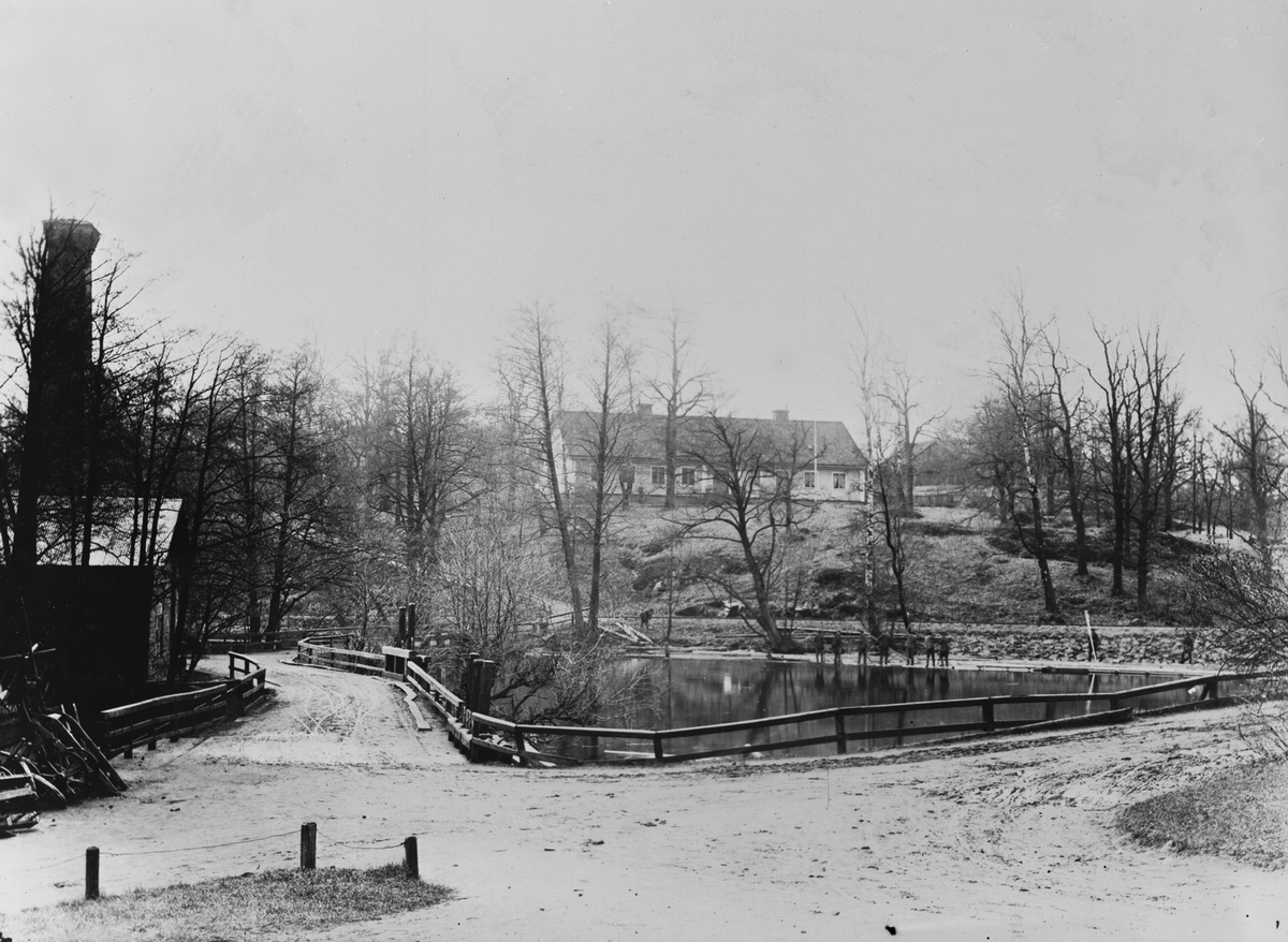 Kassörsbostaden vid Ankarsrums Bruk. Ankarsrums första handelsbod. Redskapen och verktygen till vänster är uppresta mot smedjans gavel. Skorstenen är till martinverket. Smeddammen i förgrunden.