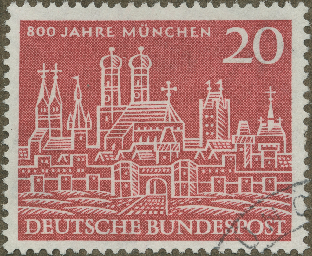 Frimärke från Väst Tyskland, 1958. Motiv av Stiliserad bild över Tornen i München München 800 år 1158-1958.