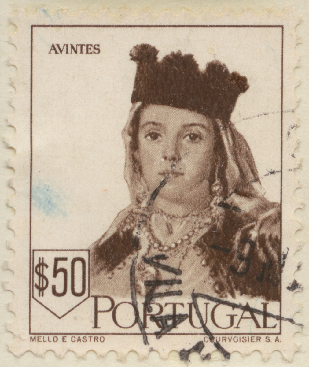Frimärke från Portugal, 1947. Motiv av kvinnodräkt, Avintes.