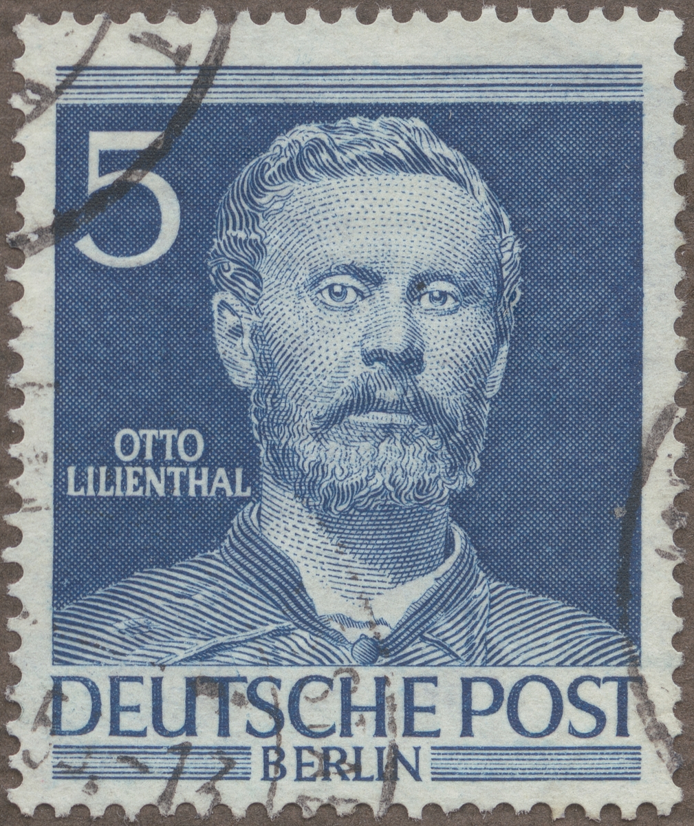 Frimärke från Tyskland, 1952. Motiv av Otto Lilienthal: 1848-1896. Byggde år 1890 en "glidflygare" av fågeltyp med vilken han 1891-1894 gjorde en lång serie banbrytande flygförsök. Störtade den 9 aug. 1896.