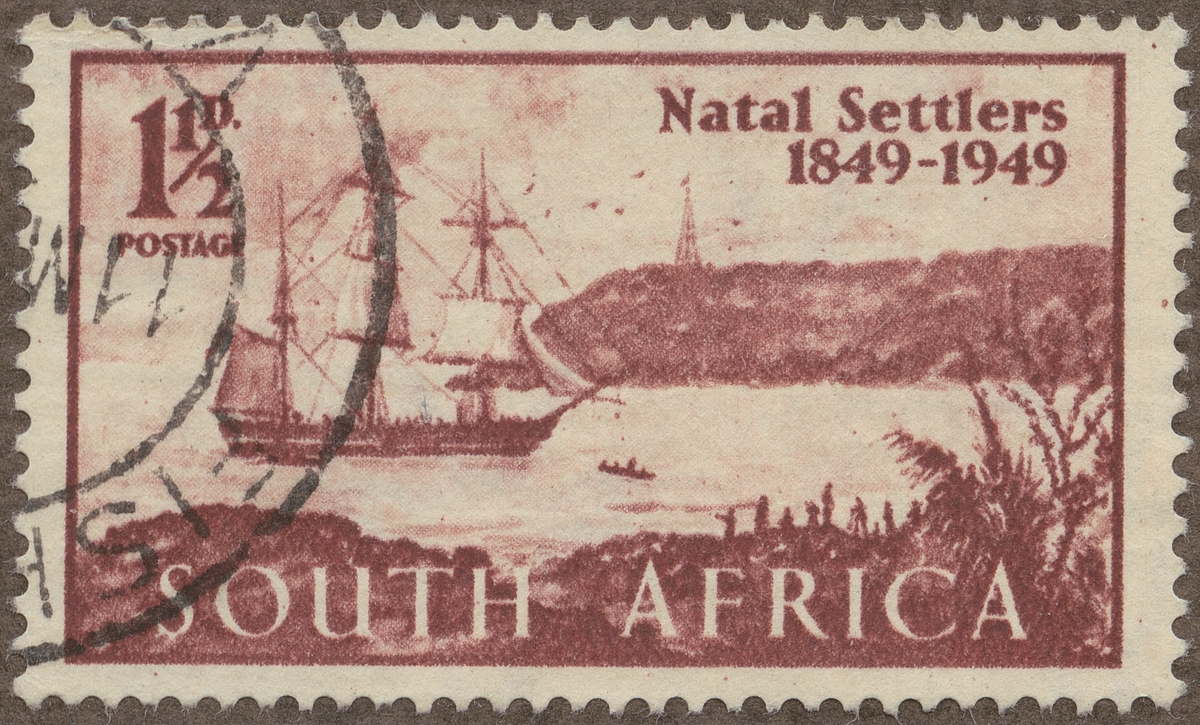 Frimärke från Sydafrikanska Unionen, 1949. Motiv av Seglare, bark, vid Durban 100-årsminne av de första kolonisternas ankomst till Natal 1849-1949.
