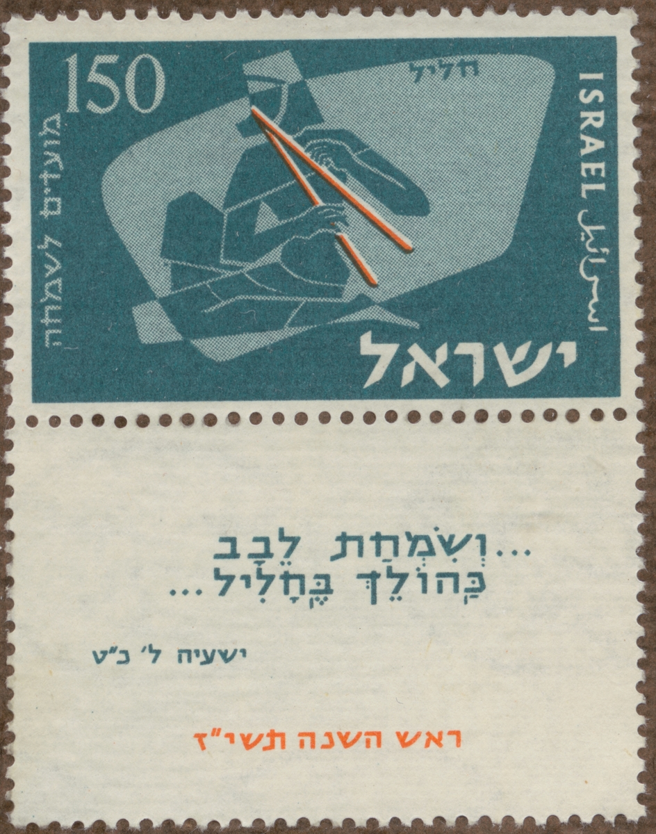 Frimärke från Israel, 1956. Motiv av Judiskt blåsintrument, dubbel oboe. "Jesaja: Kap. 30: 29: "... och edra hjärtan skola glädja sig, såsom när man under flöjters ljud tågar upp på Herrens berg, upp till Israels klippa".