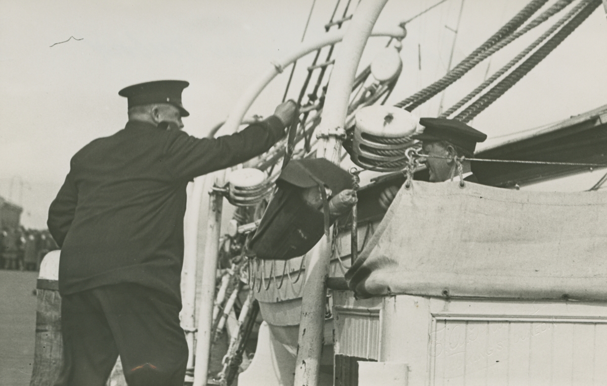 Fotografi från låda märkt Bernt Balchen. Balchen var norsk-amerikansk flygare, polarforskare och militär. Motiv av brevbärare som ger väska med post till en besättningsman på båt.