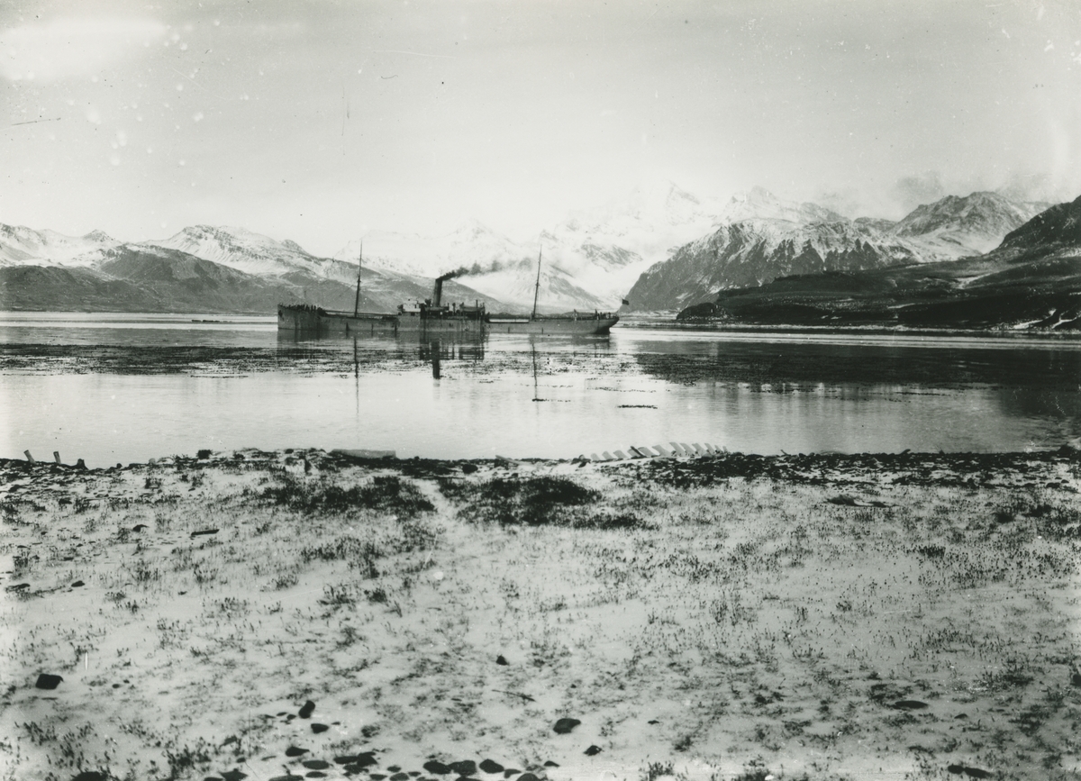 Bild från expedition i Antarktisområdet. Vy över båtar och berg i King Edward Cove.