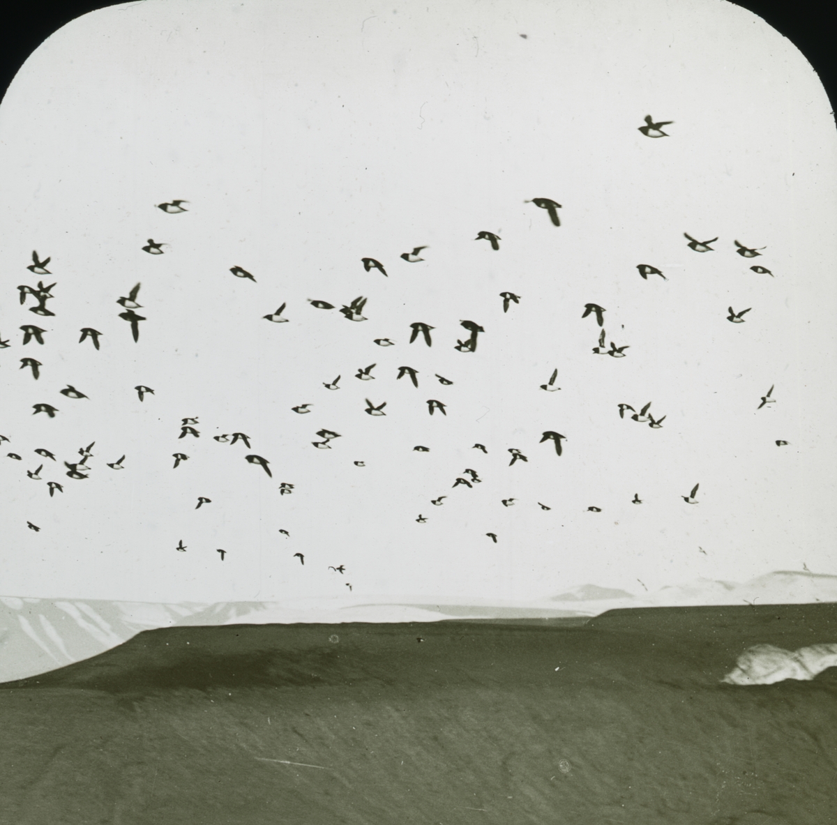 Fotografi från expedition till Spetsbergen. Motiv av fågelflock som flyger i himlen.