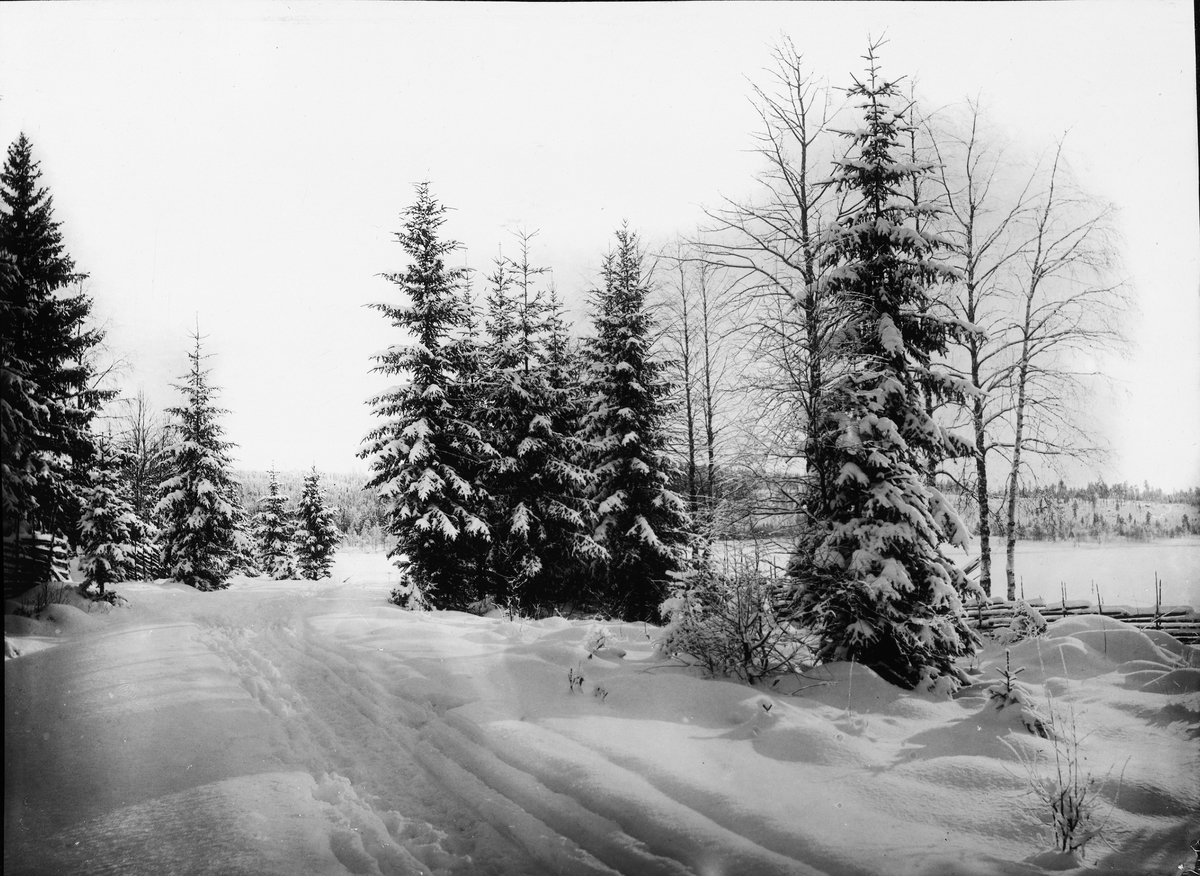 Fönsterbild med motiv av snölandskap, möjligen i Hedemoratrakten.