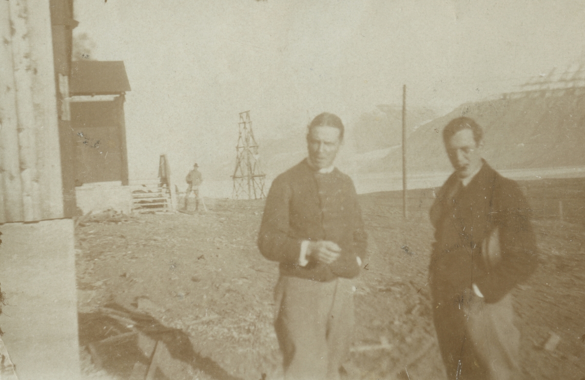 Fotografi från expedition till Spetsbergen. Motiv av två män utanför hus vid Sveagruvan.